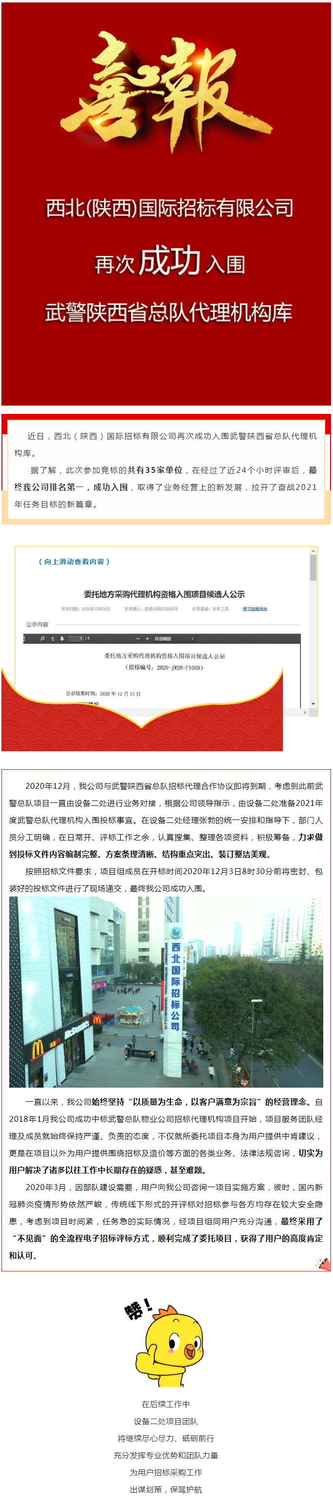 喜報(bào)!我公司再次成功入圍武警陜西省總隊(duì)代理機(jī)構(gòu)庫