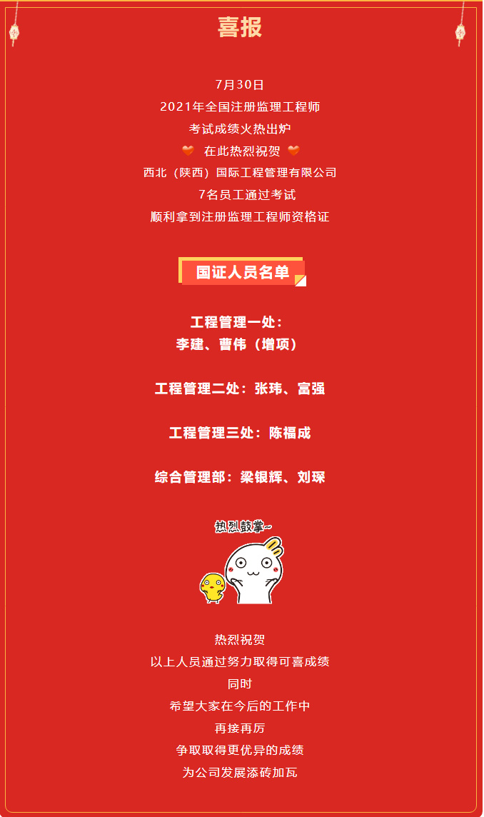 喜訊!西北(陜西)國(guó)際工程管理有限公司7人通過(guò)監(jiān)理國(guó)證考試