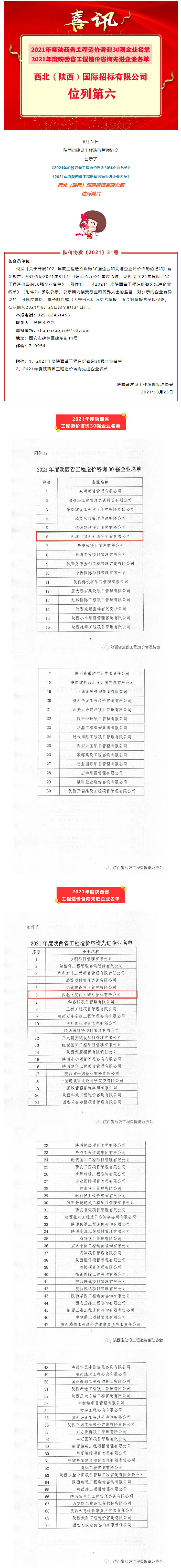 2021年度陜西省工程造價咨詢30強企業(yè)與先進企業(yè)名單公示!我公司位列第六!