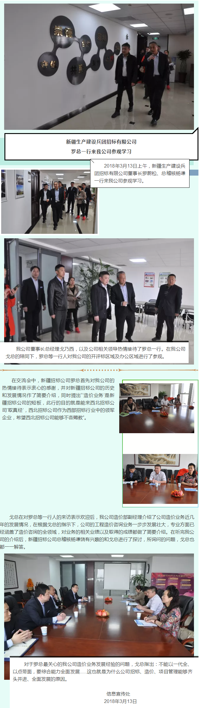 新疆生產(chǎn)建設(shè)兵團(tuán)招標(biāo)有限公司羅總一行來(lái)我公司參觀學(xué)習(xí)